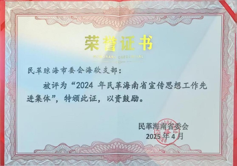 民革琼海市委会海软支部获评“2024年民革海南省宣传思想工作先进集体”