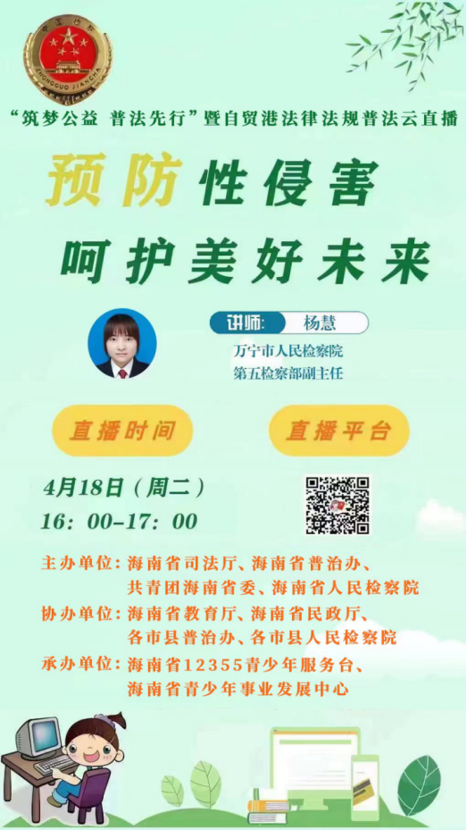 为落实《海南省未成年人“护苗”专项行动方案》要求,深入开展海南省未成年人“护苗”专项行动,引导家长增强法律观念,提高未成年人自我保护意识,强化未成年人保护和预防未成年人犯罪,海南省司法厅、海南省普治办、 、海南省人民检察院联合举办“筑梦公益 普法先行”暨自贸港法律法规普法云直播活动,为未成年人健康成长保驾护航。